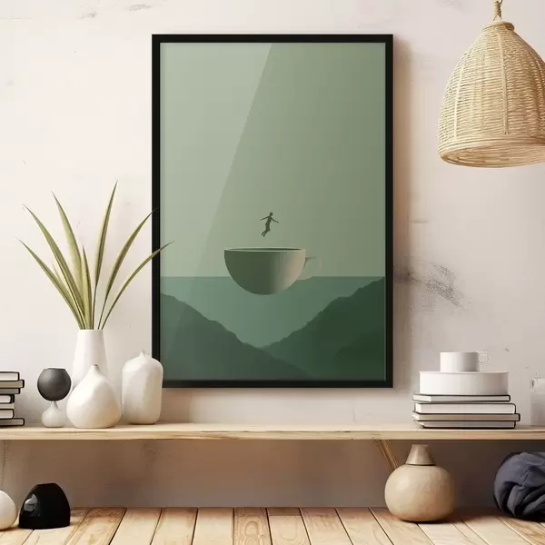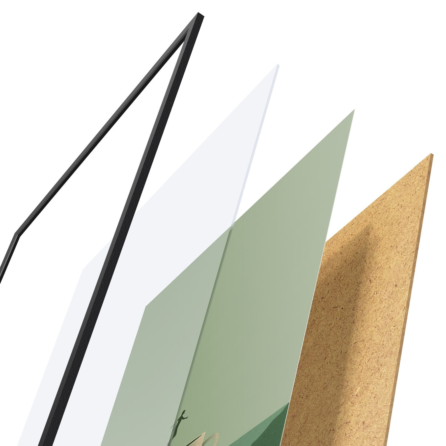 El póster consta de marco, plexiglás, imagen impresa y soporte de aglomerado. El póster puede colgarse inmediatamente en la pared gracias a los soportes de la parte posterior.