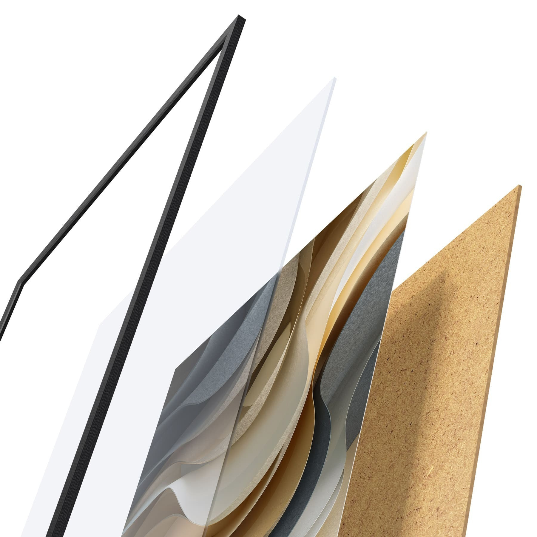 El póster consta de marco, plexiglás, imagen impresa y soporte de aglomerado. El póster puede colgarse inmediatamente en la pared gracias a los soportes de la parte posterior.