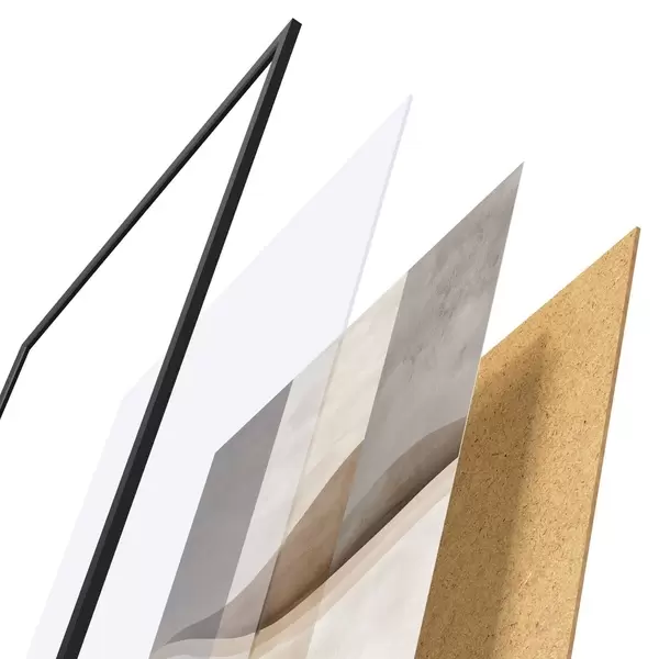 El póster consta de marco, plexiglás, imagen impresa y soporte de aglomerado. El póster puede colgarse inmediatamente en la pared gracias a los soportes de la parte posterior.
